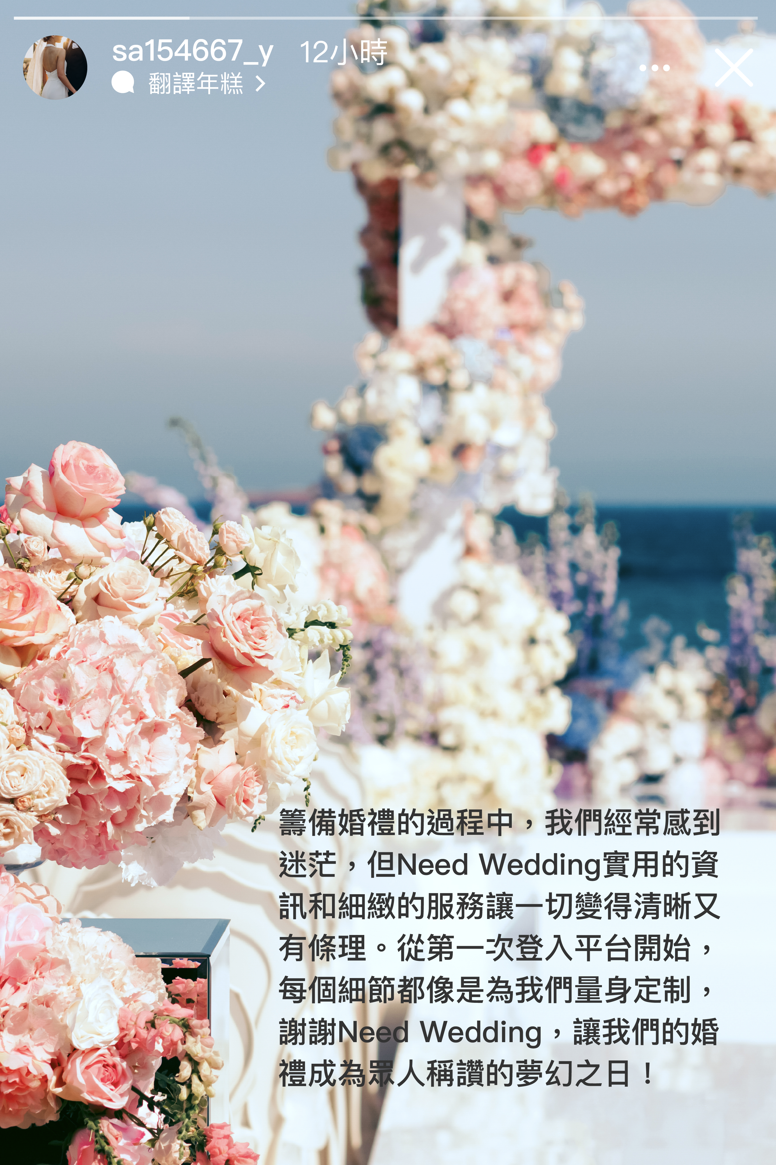 在籌備婚禮的過程中,我們感到無比焦慮,但Need Wedding的專業資訊為我們提供了無微不至的幫助,讓我們輕鬆應對每一個挑戰。最後的婚禮超出我們的預期,謝謝你們讓我們的夢想成真!